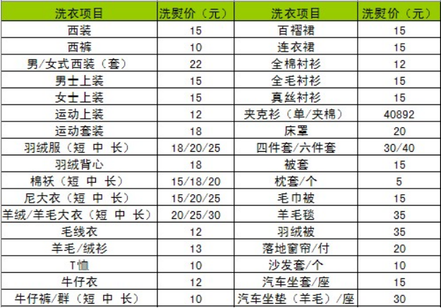 一般干洗店收費價格表詳細
