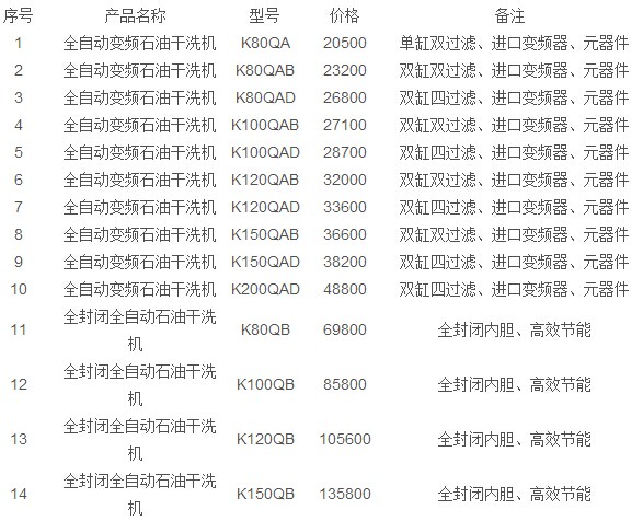 在ucc國際洗衣品牌總部,干洗機(jī)主要有兩種:石油干洗機(jī)和四氯乙烯干洗機(jī),石油干洗機(jī)規(guī)格方面有8-12公斤不等,價格方面在2-6萬元左右;而四氯乙烯干洗機(jī),因為設(shè)備技術(shù)較為先進(jìn),價格會比石油干洗機(jī)要高一些,一般都子啊6-12萬元左右。投資者可以根據(jù)自己干洗店實際需求和規(guī)模選擇合理的干洗機(jī)。