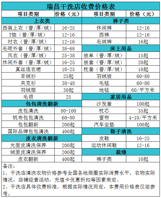 瑞昌干洗店收費價格表【詳細收費標準】怎么收費更賺錢