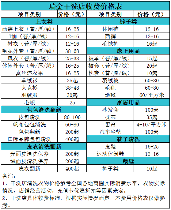 瑞金干洗店收費價格表【詳細收費標準】怎么收費更賺錢
