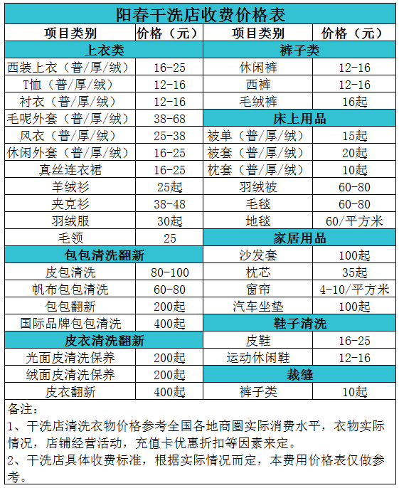 陽春干洗店收費價格表【詳細收費標準】怎么收費更賺錢