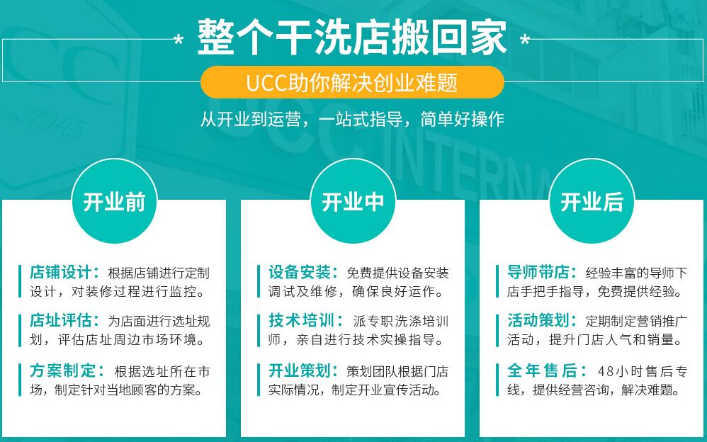 干洗店加盟哪個品牌最好?現下干洗業的發展空間非常廣闊,很多投資者都向干洗業加盟投資,市場上眾多干洗品牌品牌的出現,漸漸的也產生了優劣之分,在這里,小編推薦UCC國際洗衣,下面就讓我們